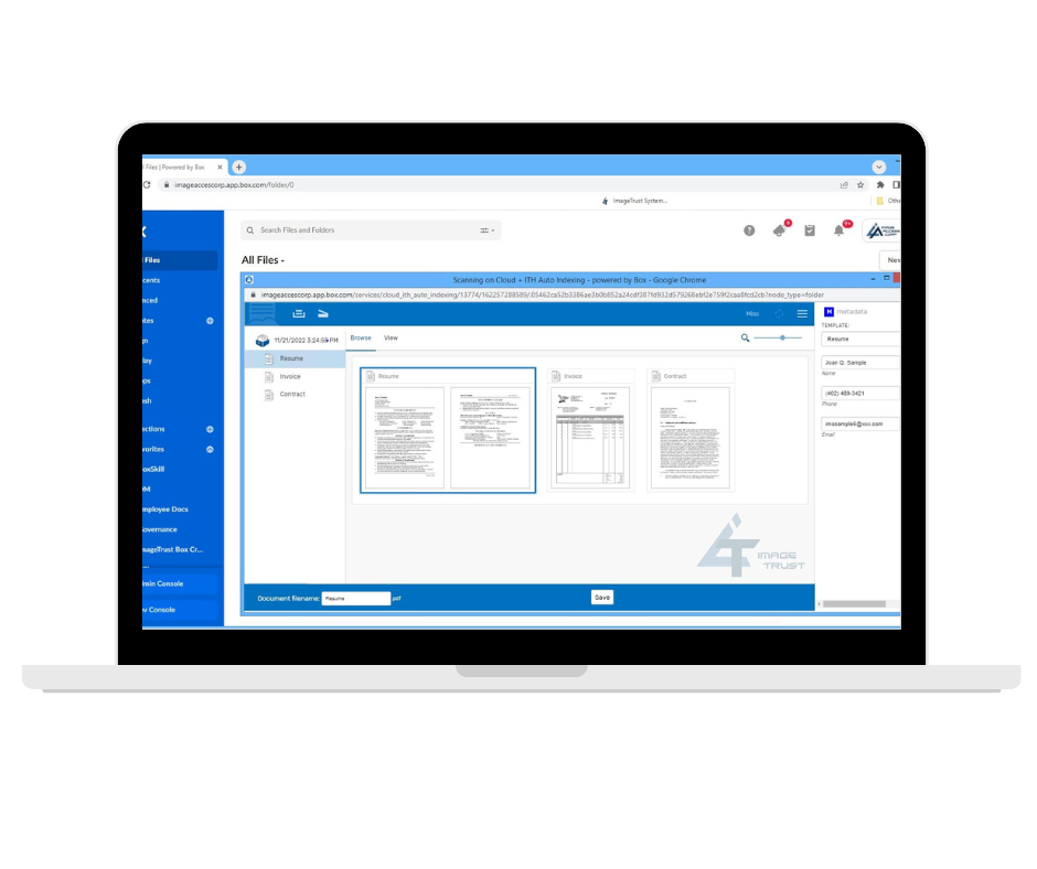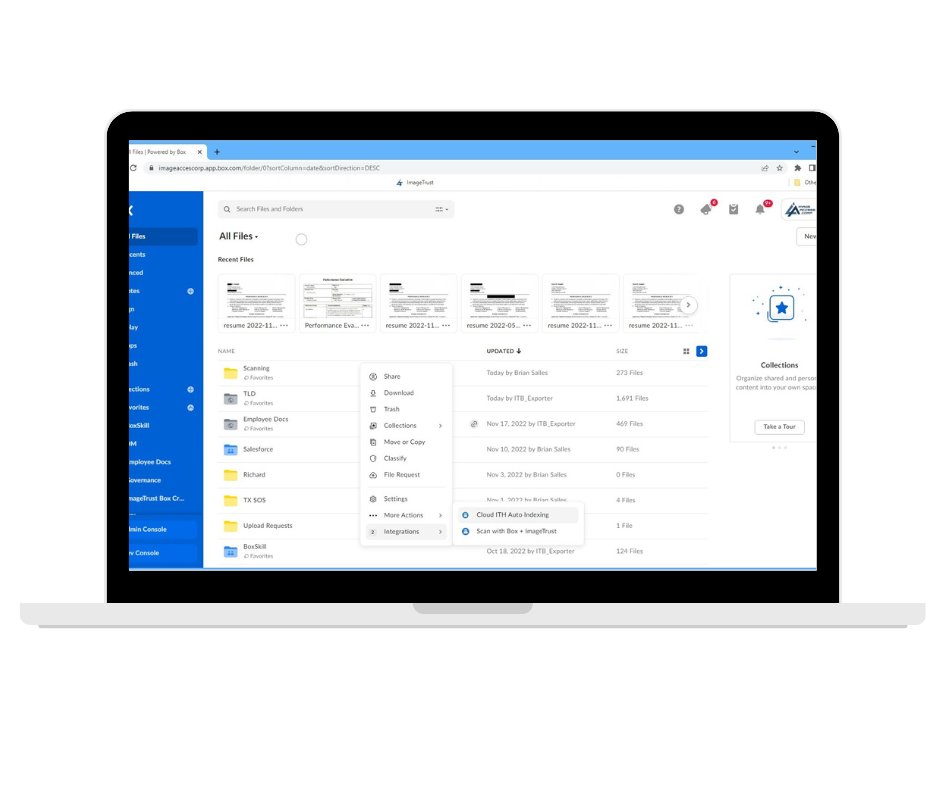 Through the use of a seamless integration, content can now be stored within the Box content cloud, and surfaced within Salesforce. ImageTrust empowers this further by offering guided document intake & upload within salesforce, automated case creation, and insight that will drive content clarity whether your team is working within Box or Salesforce.